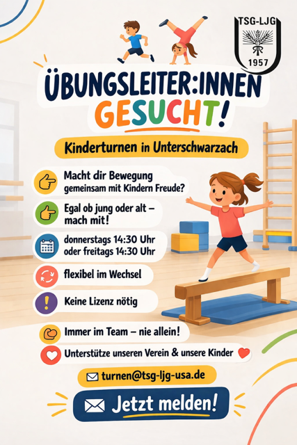 Übungsleiter:innen für das Kinderturnen gesucht! Um unser bewährtes Angebot im Kinderturnen weiterhin aufrechterhalten zu können, suchen wir engagierte Jugendliche, Erwachsene und Senior:innen, die unser Übungsleiterteam unterstützen möchten. Ein Einstieg ist ab sofort möglich, spätestens jedoch ab September erforderlich. Ohne zusätzliche Unterstützung wird es ab Herbst schwierig, das Turnen wie gewohnt fortzuführen. Die Übungsstunden werden grundsätzlich im Team durchgeführt: Zwei Personen l…